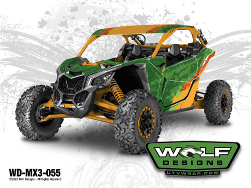Wolf Designs' premium UTV wrap kits for the Can-am Maverick X3 are digitally printed on the highest quality 3M brand vinyl ensuring the very best product with a finish and fit that's mistaken for paint. Each wrap kit is fabricated at the time your order is placed, and may take up to 7 business days to manufacture.