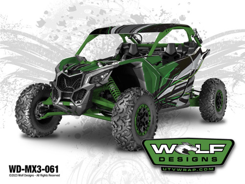 Wolf Designs' premium UTV wrap kits for the Can-am Maverick X3 are digitally printed on the highest quality 3M brand vinyl ensuring the very best product with a finish and fit that's mistaken for paint. Each wrap kit is fabricated at the time your order is placed, and may take up to 7 business days to manufacture.